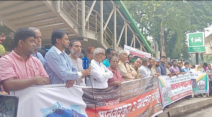 ঢাকা-সিলেট মহাসড়ক, রেল ও বিমান যোগাযোগ ব্যবস্থার অব্যবস্থাপনা ও চরম জনদুর্ভোগের প্রতিবাদে জাতীয় প্রেসক্লাবের সামনে মানববন্ধন করেছেন ঢাকাস্থ বৃহত্তর সিলেটবাসী।