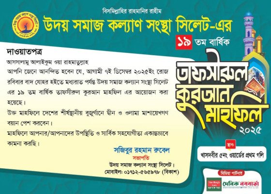 উদয় সমাজ কল্যাণ সংস্থা সিলেট এর ১৯ তম ওয়াজ মাহফিল রবিবার ৭ ডিসেম্বর বেলা ২টা হতে রাত ১২টা পর্যন্ত সিলেট নগরীর ৫নং ওয়ার্ডের প্রথম গলিতে অনুষ্ঠিত হবে।