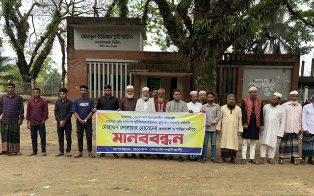 সিলেটের গোয়াইনঘাট উপজেলার তোয়াকুল ইউনিয়ন উপ-সহকারী ভূমি কর্মকর্তা মোহাম্মদ দেলোয়ার হোসেনকে অপসারণের দাবিতে মানববন্ধন অনুষ্ঠিত হয়েছে।