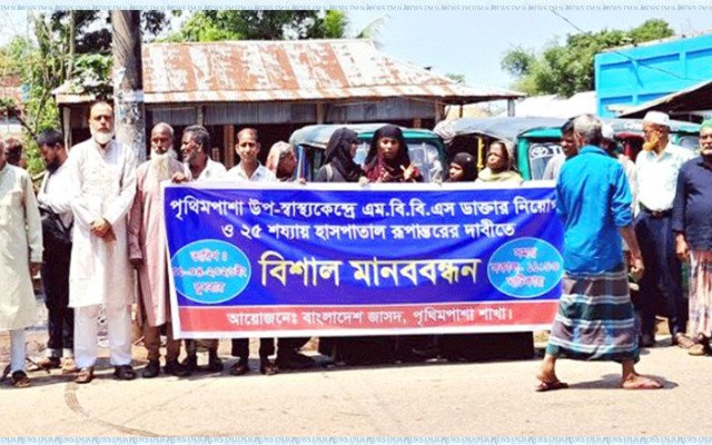 বুধবার (১ এপ্রিল) দুপুরে উপস্বাস্থ্য কেন্দ্রের সামনে জাসদের পৃথিমপাশা ইউনিয়ন শাখার উদ্যোগে এ মানববন্ধন অনুষ্ঠিত হয়।