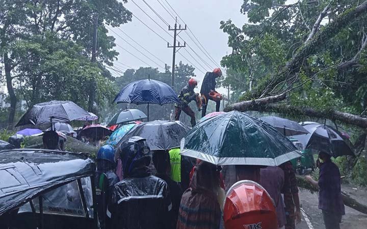 ঘটনাস্থলে উপস্থিত ফায়ার সার্ভিসের একটি দল গাছটি সরিয়ে যান চলাচল স্বাভাবিক করে।