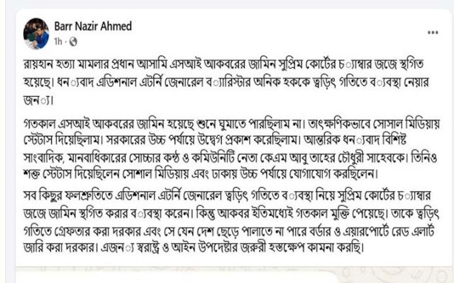 এর প্রেক্ষিতে ব্যারিস্টার অনিক হক দ্রুত পদক্ষেপ নিয়ে সুপ্রিম কোর্টের চেম্বার জজে জামিন স্থগিত করান। তবে ততক্ষণে আকবর মুক্তি পেয়ে যান। ব্যারিস্টার নাজির আহমদ সামাজিক যোগাযোগমাধ্যমে পোস্ট দিয়ে আকবরকে অবিলম্বে গ্রেফতারের পাশাপাশি সীমান্ত ও বিমানবন্দরে রেড অ্যালার্ট জারির আহ্বান জানিয়েছেন।