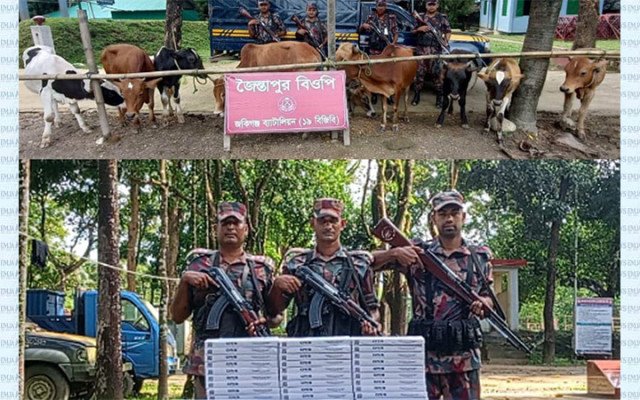 অন্যদিকে, রোববার সন্ধ্যায় জৈন্তাপুর উপজেলার জমদোয়ার সীমান্ত এলাকায় অভিযান চালায় জৈন্তাপুর বিওপি’র একটি টহল দল। এসময় মালিকবিহীন অবস্থায় ভারতীয় ১০টি গরু ও একটি পিকআপ জব্দ করা হয়। এসবের বাজারমূল্য ধরা হয়েছে ২৭ লাখ টাকা।