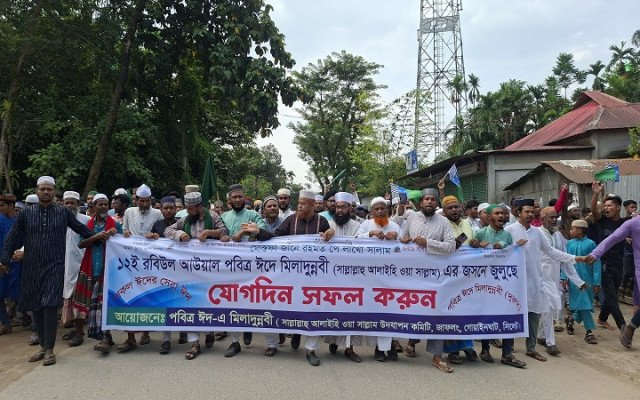 সিলেটের জাফলংয়ে পবিত্র ঈদে মিলাদুন্নবী (সা.) উপলক্ষে রোববার বর্ণাঢ্য র্যালি ও আলোচনা সভার আয়োজন করা হয়েছে।